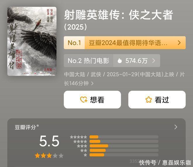 《射雕英雄传:侠之大者》豆瓣开分55 创2025春节档最差口碑 发布日期:2025-02-05 08:05 点击次数:140