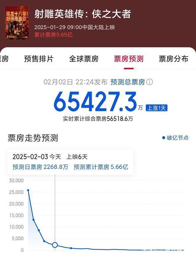 票房方面:《射雕英雄传:侠之大者》上映6天累计票房5.65亿,表现不及预期!在预售阶段《射雕英雄传:侠之大者》依靠肖战的人气(粉丝消费)一路领跑,获得了不错的排片,大年初一斩获票房2.58亿,排在当日票房榜第4位。大年初二票房为1.31亿,大年初三票房8569万,大年初四仅收获3922万,降至单日票房榜第5位。大年初五票房为2870万,被《蛟龙行动》反超。大年初六排片降至4.3%,票房为2300万。